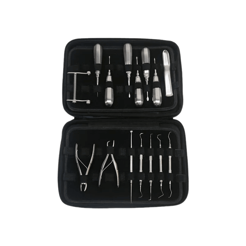 | Instruments | Bâillon buccal (8 cm) Curette sous-gingivale Détartreur de faucille Détartreur supragingival Jaquette Pince d’extraction courbée (12,5 cm) Pince d’élévation pointe racine droite Pince à tartre bec courbe (11,5 cm) Sonde/explorateur en crochet de berger (1-10mm) Écarteur Minnesota (14 cm) Élévateur périosté fin à double extrémité Élévateurs (1, 2, 3, 4 et 5 mm) |